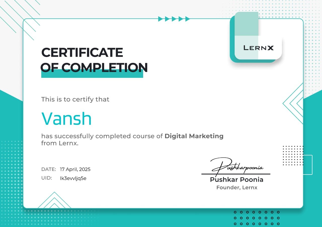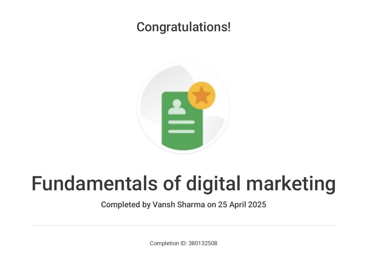 My professional growth is backed by globally recognized certifications that merge marketing strategy, digital tools, and creative execution, including the Fundamentals of Digital Marketing by Google, where I gained in-depth knowledge of SEO, SEM, content marketing, and analytics to craft impactful campaigns that drive measurable business growth; the AI Workshop by Be10x, where I acquired skills in leveraging artificial intelligence for marketing automation, customer segmentation, predictive analytics, and personalized content delivery; and Graphic Designing Using Canva by LearnX, where I mastered visual storytelling techniques to design high-converting social media creatives, pitch decks, and marketing visuals that enhance brand recall.